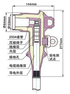 HYLT-15(24)/250欧式肘型电缆接头应用于符合DIN47636 250A标准套管的环网柜、高压引出线电缆的连接,可以水平安装,减少电缆的弯曲半径,其测试点可安装短路故障指示器或带电显示器,实现快速故障定位或线路带电状态指示,不可带电插曲拔。